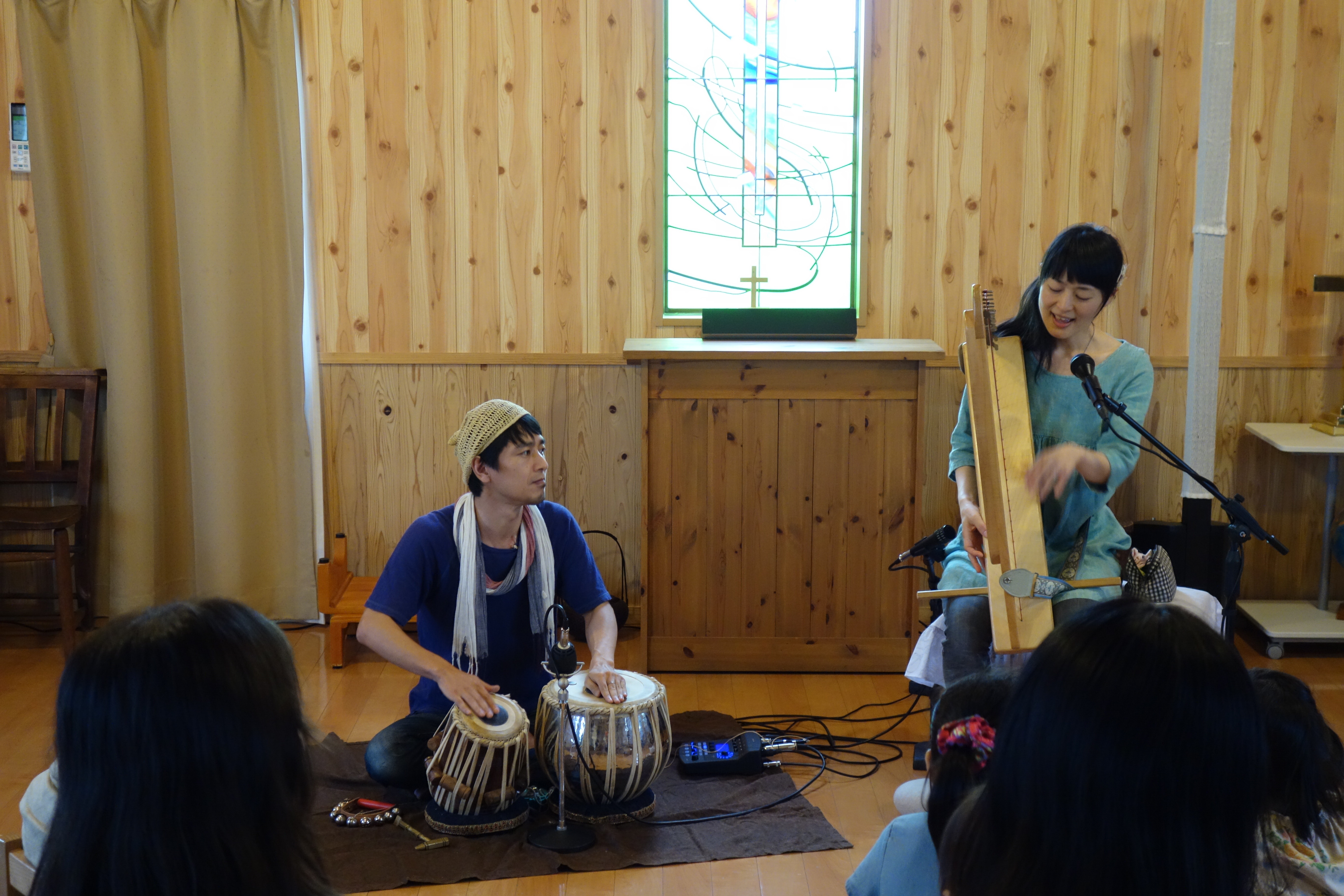 空からの恵みをテーマに演奏の旅をしている、ハープ弾き歌いの太宰陽子、タブラ(インド太鼓) 太宰敏雄の夫婦ユニットです。