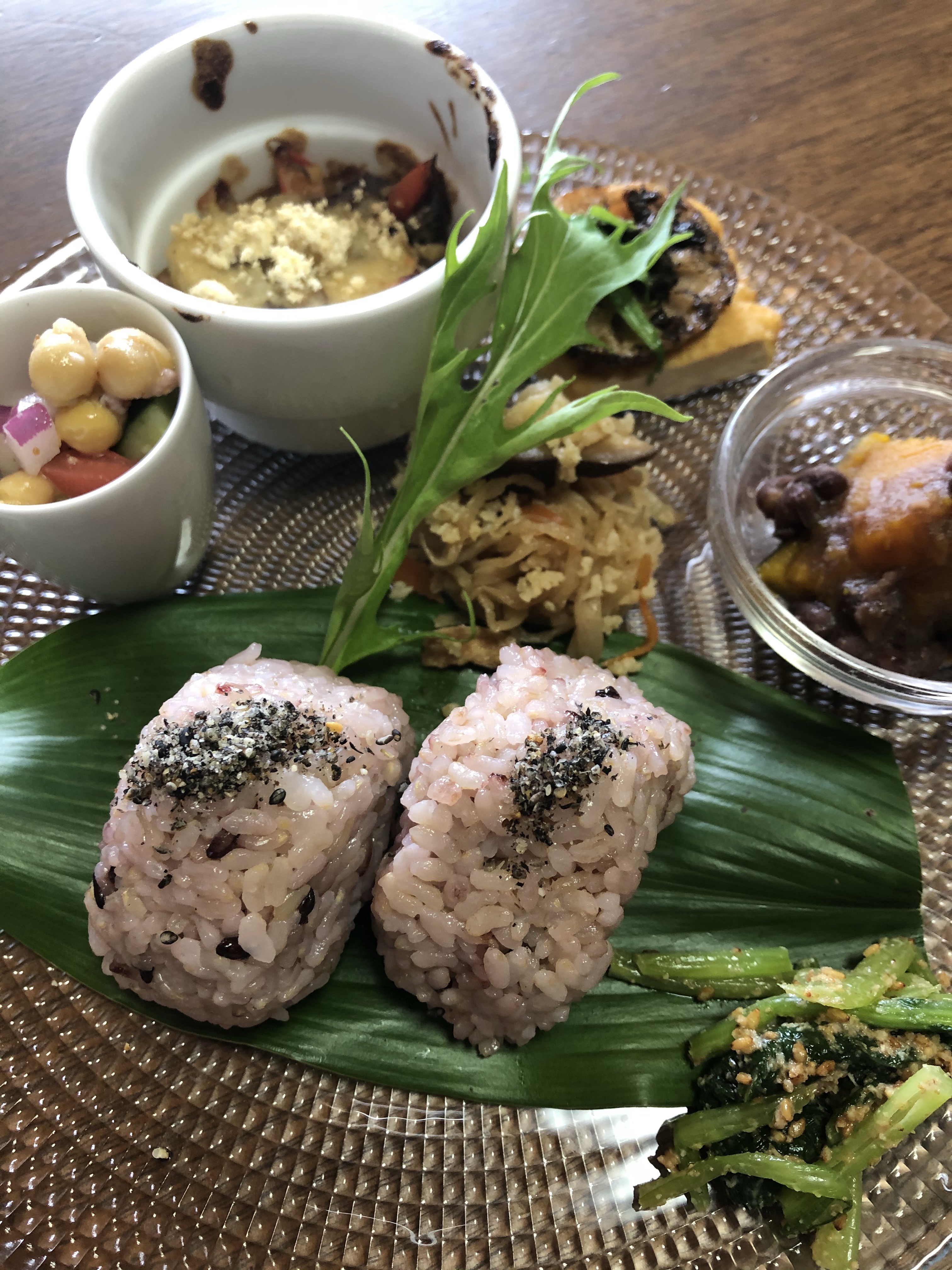 ひよこ豆の甘酒マリネ・発芽玄米黒米のおにぎり・ごぼうの重ね煮ホワイトシチュー